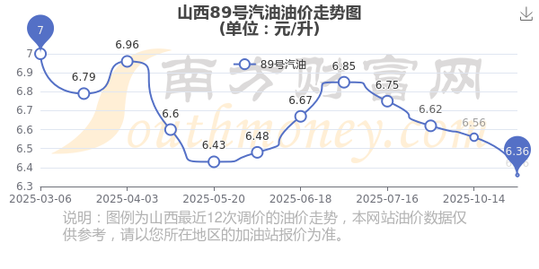 11月7日,山西89號汽油的價格是6.36元每升,本次的調整時間為10月28日,對比上次的調整下跌了0.2元,下跌3.049%,11月10日24時為下一輪油價調整時間,還有3.51天。