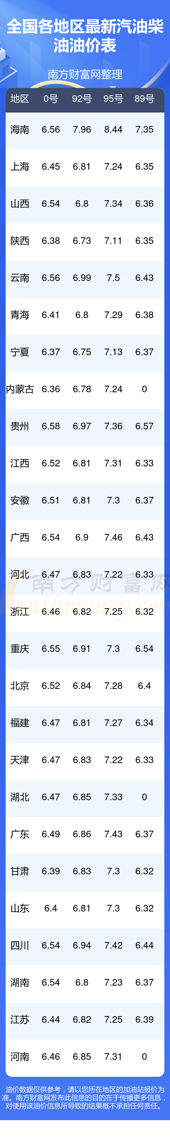 2025年11月7日全國(guó)各地汽油價(jià)格表一覽