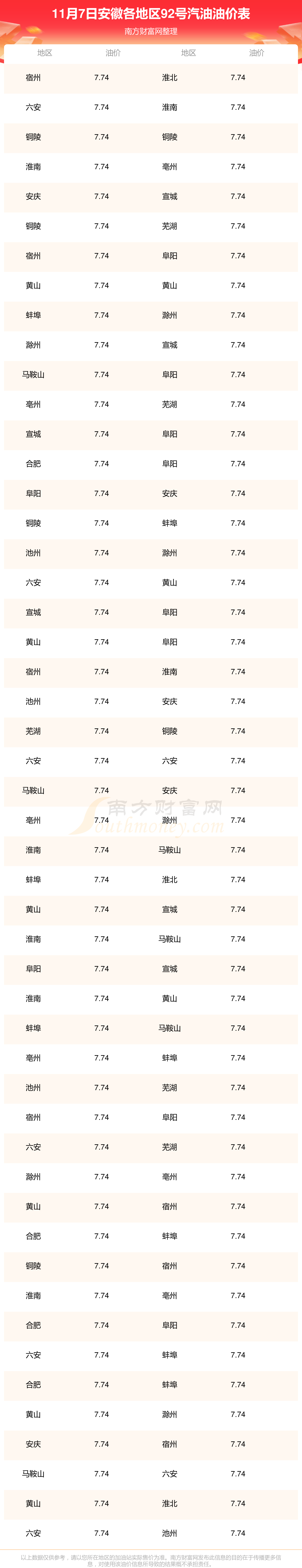 2025年11月7日安徽92號(hào)汽油最新價(jià)格一覽表