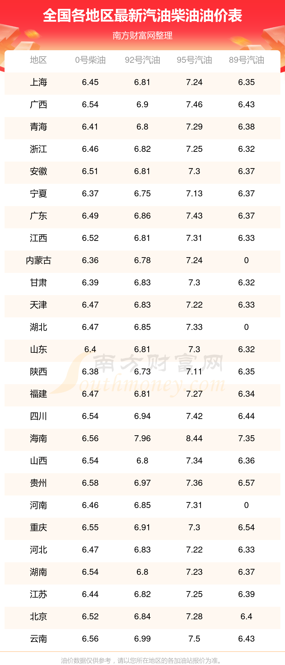 油價(jià)數(shù)據(jù)僅供參考,請(qǐng)以您所在地區(qū)的加油站報(bào)價(jià)為準(zhǔn)。南方財(cái)富網(wǎng)發(fā)布此信息的目的在于傳播更多信息,對(duì)使用該油價(jià)信息所導(dǎo)致的結(jié)果概不承擔(dān)任何責(zé)任。
