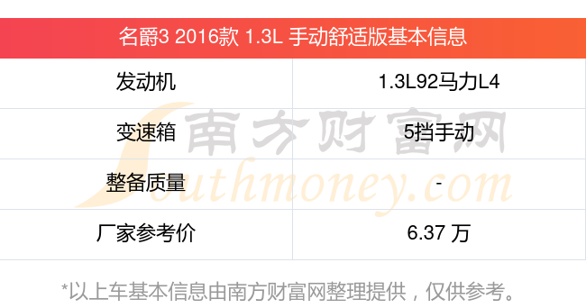 名爵3 2016款 1.3L 手動(dòng)舒適版搭載了一臺(tái)1.3L92馬力L4自然吸氣發(fā)動(dòng)機(jī),采用5擋手動(dòng)擋變速箱,廠家參考價(jià)6.37萬(wàn)元。