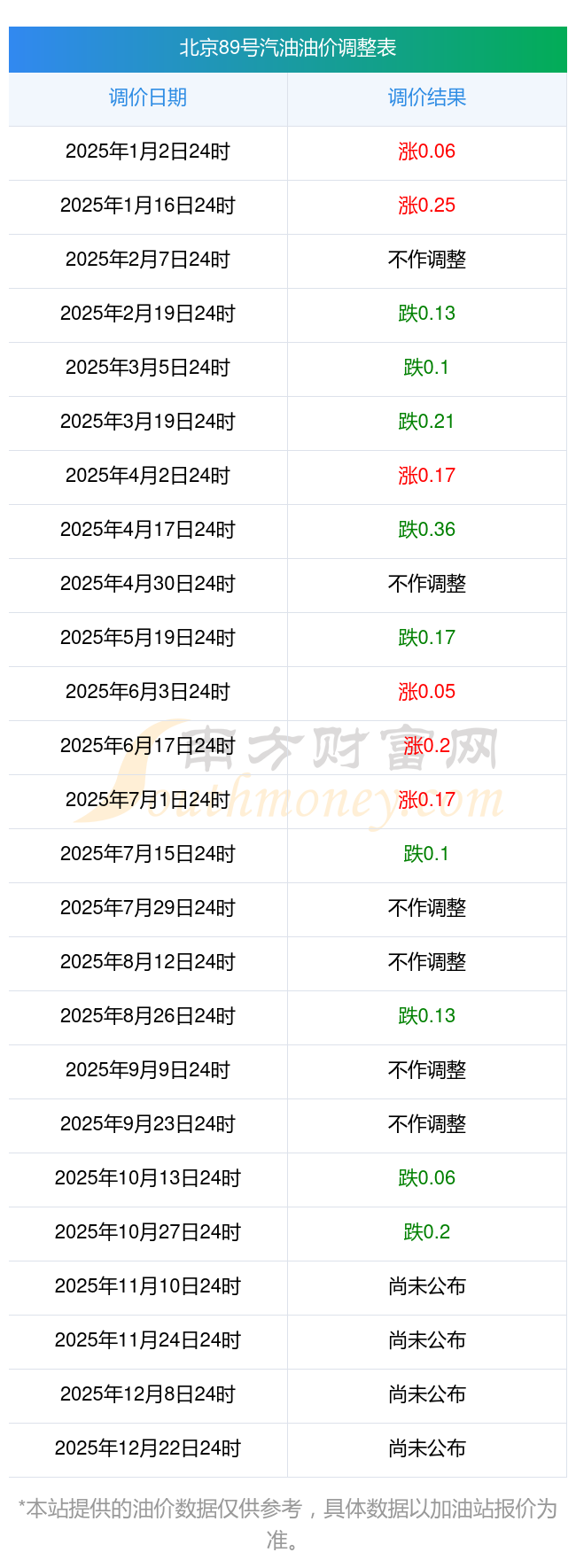 11月7日,北京89號汽油的價格是6.4元每升,本次的調(diào)整時間為10月28日,對比上次的調(diào)整降了0.2元,降3.03%,下次調(diào)整時間為11月10日24時,還有3.46天。