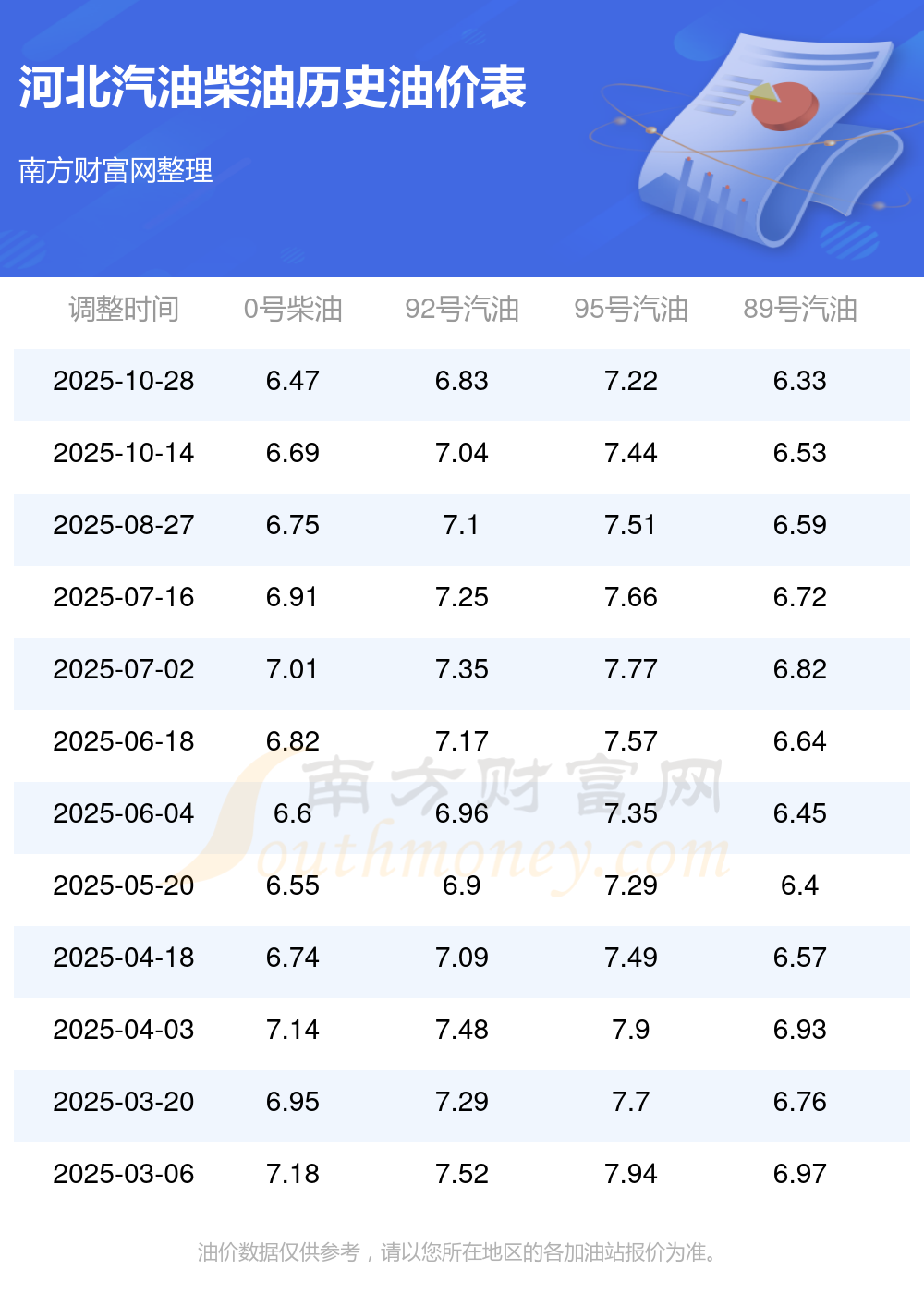 河北汽油、柴油11月7日每升最新價格多少錢一升?本次油價調整時間為10月28日,92號汽油為6.83元,下跌了0.21元;95號汽油為7.22元,下跌了0.22元;89號汽油為6.33元,下跌了0.2;0號柴油為6.47元,下跌了0.22元。