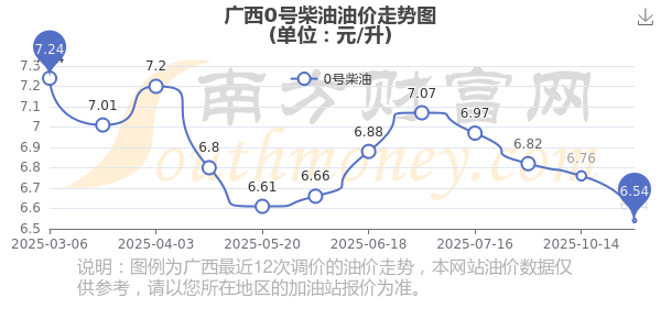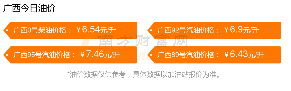 11月7日,廣西汽油、柴油的價(jià)格為10月28日調(diào)整后的價(jià)格。具體為:92號(hào)汽油6.9元,下調(diào)了0.22元;95號(hào)汽油7.46元,下調(diào)了0.23元;89號(hào)汽油6.43元,下調(diào)了0.19;0號(hào)柴油6.54元,下調(diào)了0.22元。