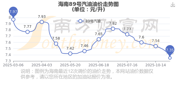11月7日,海南89號汽油的價格是7.35元每升,本次的調(diào)整時間為10月28日,對比上次的調(diào)整下跌了0.19元,下跌2.52%,11月10日24時為下一輪油價調(diào)整時間,還有3.44天。