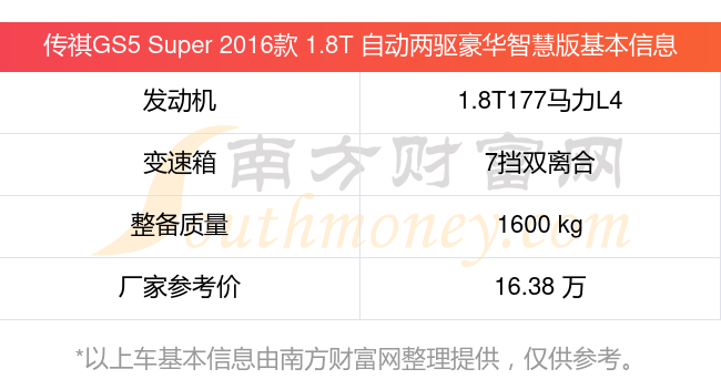 傳祺GS5 Super 2016款 1.8T 自動兩驅(qū)豪華智慧版動力上搭載的是一臺1.8T177馬力L4渦輪增壓發(fā)動機,匹配7擋雙離合自動檔變速箱,燃料形式為汽油,常規(guī)整備質(zhì)量1600kg,廠家參考價16.38萬元。