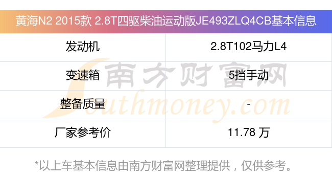 黃海N2 2015款 2.8T四驅柴油運動版JE493ZLQ4CB動力方面,搭載的是一臺2.8T102馬力L4渦輪增壓發(fā)動機,匹配5擋手動擋變速箱,燃料形式為柴油,廠家參考價11.78萬元。