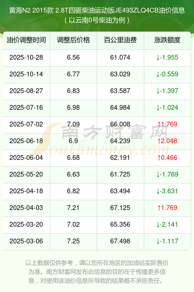 按照10月28日0號柴油最新調整價格6.56元/升來計算(以云南為例),該車型百公里平均油費為61.074元,按照上一輪10月14日調整價格6.77元/升來計算,百公里平均油費為63.029元,對比上一輪少花1.955元,下一輪油價調整時間為11月10日24時。
