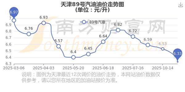 11月7日,天津89號(hào)汽油的價(jià)格是6.33元每升,本次的調(diào)整時(shí)間為10月28日,對(duì)比上次的調(diào)整下跌了0.2元,下跌3.063%,11月10日24時(shí)為下一輪油價(jià)調(diào)整時(shí)間,還有3.41天。