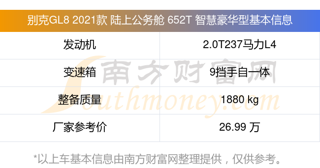 別克GL8 2021款 陸上公務(wù)艙 652T 智慧豪華型搭載了一臺(tái)2.0T237馬力L4渦輪增壓發(fā)動(dòng)機(jī),采用9擋手自一體自動(dòng)檔變速箱,常規(guī)整備質(zhì)量1880kg,廠(chǎng)家參考價(jià)26.99萬(wàn)元。
