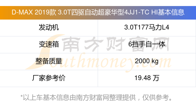 D-MAX 2019款 3.0T四驅(qū)自動超豪華型4JJ1-TC HI動力方面,搭載的是一臺3.0T177馬力L4渦輪增壓發(fā)動機,匹配6擋手自一體自動檔變速箱,燃料形式為柴油,常規(guī)整備質(zhì)量2000kg,廠家參考價19.48萬元。