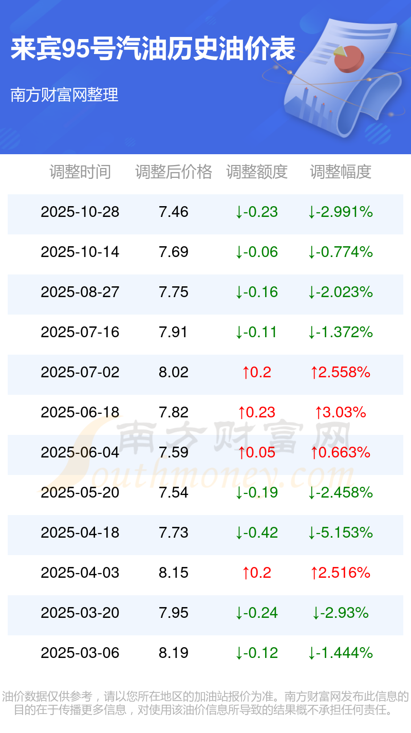 2025年95號(hào)汽油價(jià)格調(diào)整一覽表