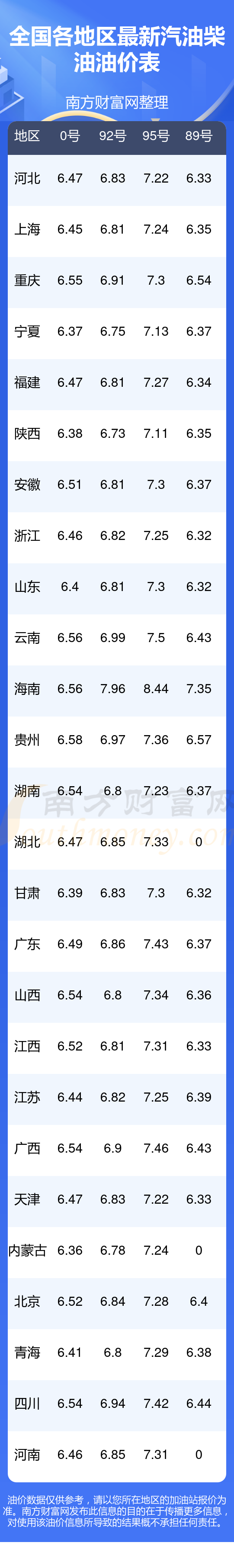 95號汽油平均價格:7元每升,其中,最高為海南,價格8.44元/升,最低為陜西,價格7.11元/升。
