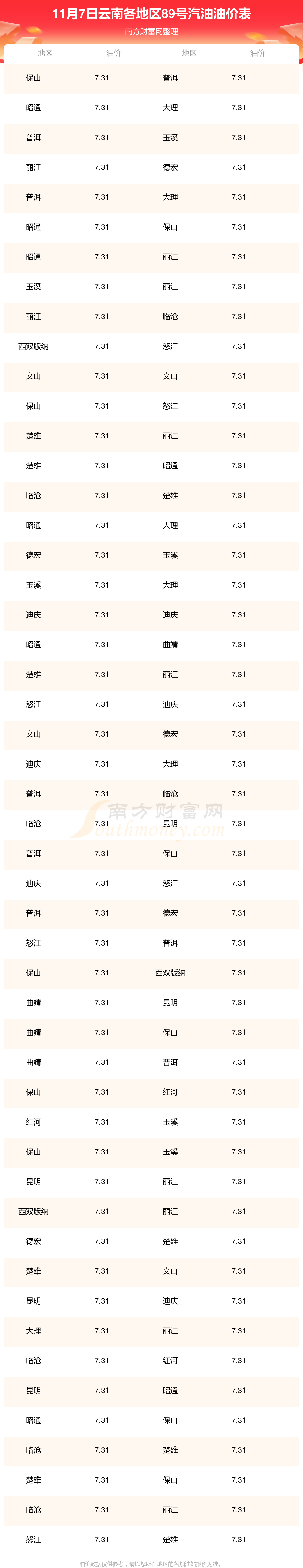 2025年11月7日云南89號(hào)汽油最新價(jià)格一覽表
