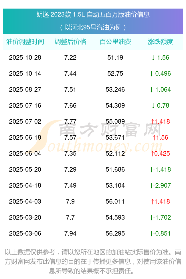 按照10月28日95號汽油最新調(diào)整價格7.22元/升來計算(以河北為例),該車型百公里平均油費為51.19元,按照上一輪10月14日調(diào)整價格7.44元/升來計算,百公里平均油費為52.75元,對比上一輪少花1.56元,下一輪油價調(diào)整時間為11月10日24時。