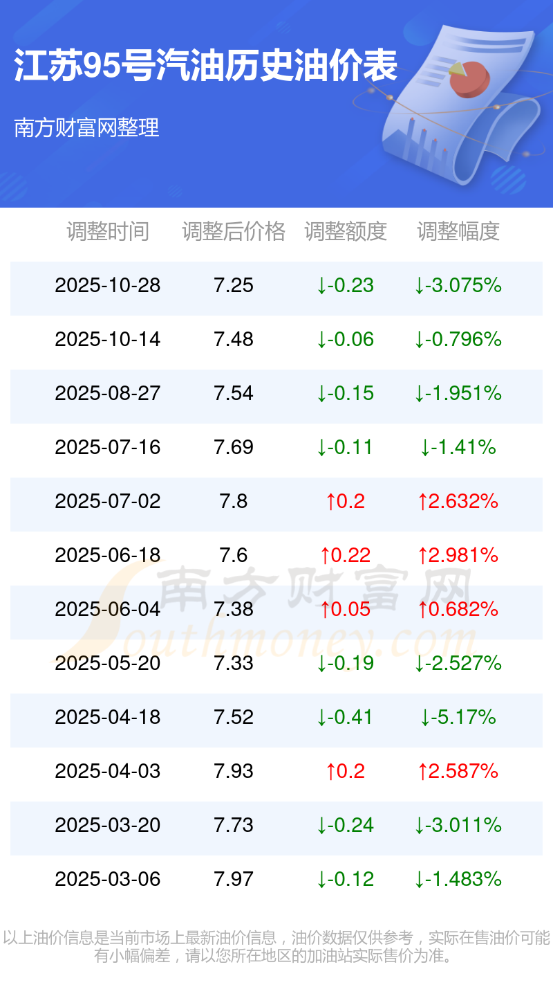 11月7日,江蘇95號(hào)汽油的價(jià)格是7.25元每升,本次的調(diào)整時(shí)間為10月28日,對(duì)比上次的調(diào)整降了0.23元,降3.075%,11月10日24時(shí)為下一輪油價(jià)調(diào)整時(shí)間,還有3.38天。