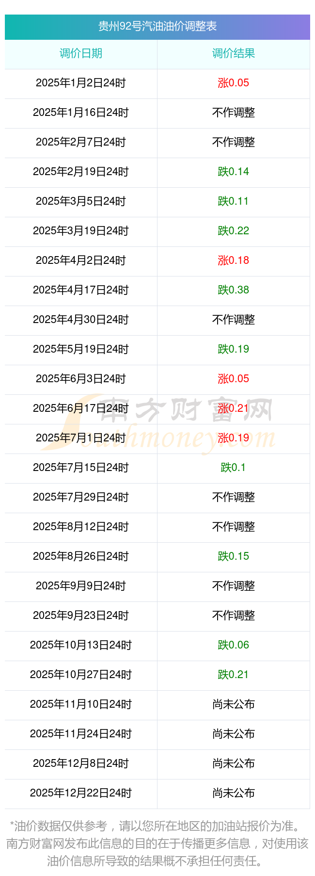 貴州92號(hào)汽油油價(jià)調(diào)整表