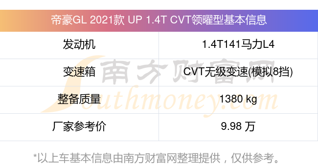 帝豪GL 2021款 UP 1.4T CVT領曜型動力上搭載的是一臺1.4T141馬力L4渦輪增壓發(fā)動機,匹配CVT無級變速(模擬8擋)自動檔變速箱,燃料形式為汽油,常規(guī)整備質量1380kg,廠家參考價9.98萬元。