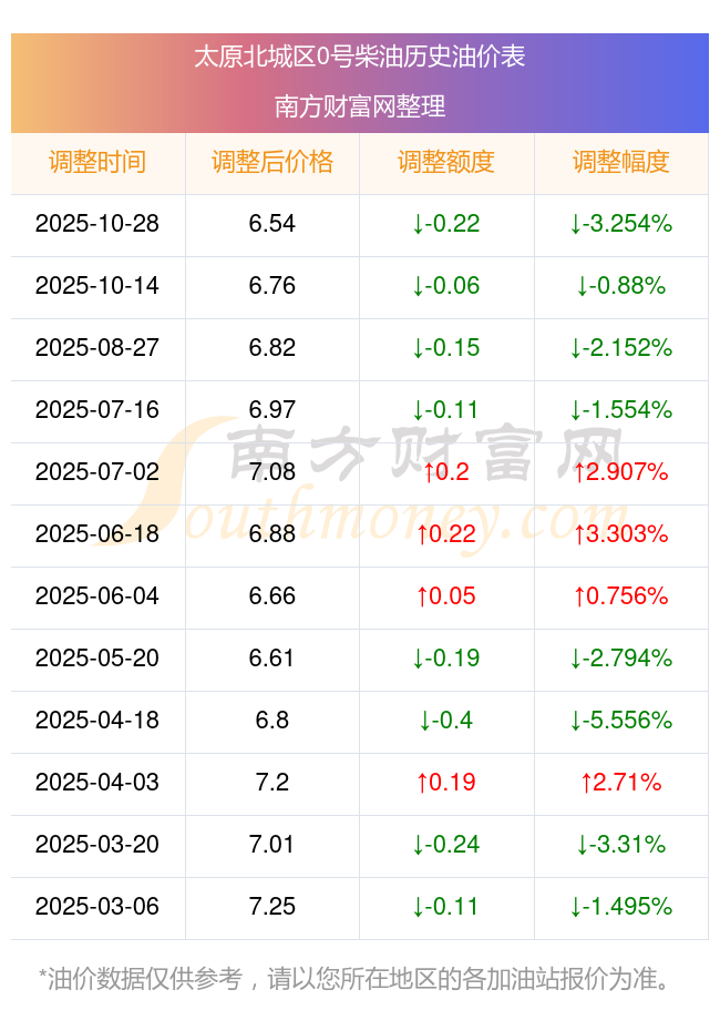 太原北城區(qū)11月7日0號(hào)柴油歷史油價(jià)調(diào)整一覽表