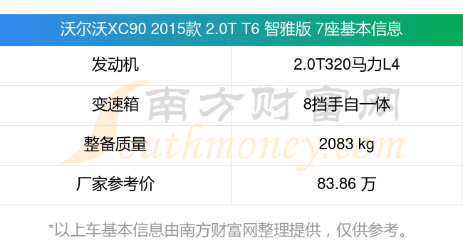 沃爾沃XC90 2015款 2.0T T6 智雅版 7座動(dòng)力上配備的是一臺(tái)2.0T320馬力L4機(jī)械+渦輪增壓發(fā)動(dòng)機(jī),匹配的是8擋手自一體自動(dòng)檔變速箱,燃料形式為汽油,常規(guī)整備質(zhì)量2083kg,廠家參考價(jià)83.86萬(wàn)元。