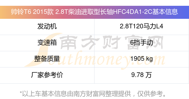帥鈴T6 2015款 2.8T柴油進(jìn)取型長(zhǎng)軸HFC4DA1-2C動(dòng)力上配備的是一臺(tái)2.8T120馬力L4渦輪增壓發(fā)動(dòng)機(jī),匹配的是6擋手動(dòng)擋變速箱,燃料形式為柴油,常規(guī)整備質(zhì)量1905kg,廠家參考價(jià)9.78萬元。