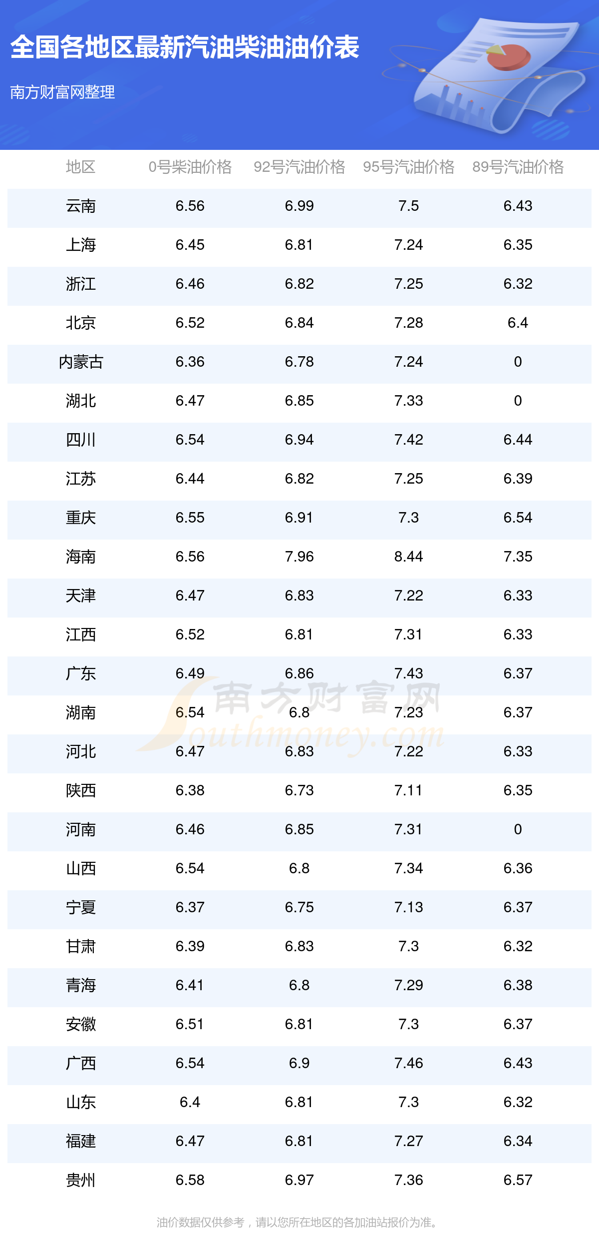 以上數(shù)據(jù)僅供參考,請以您所在地區(qū)的加油站實(shí)際售價為準(zhǔn)。南方財(cái)富網(wǎng)發(fā)布此信息的目的在于傳播更多信息,對使用該油價信息所導(dǎo)致的結(jié)果概不承擔(dān)責(zé)任。