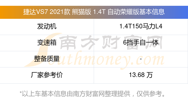 在動力方面,捷達VS7 2021款 熊貓版 1.4T 自動榮??版搭載的是一臺1.4T150馬力L4渦輪增壓發(fā)動機,匹配6擋手自一體自動檔變速箱,燃料形式為汽油,廠家參考價13.68萬元。