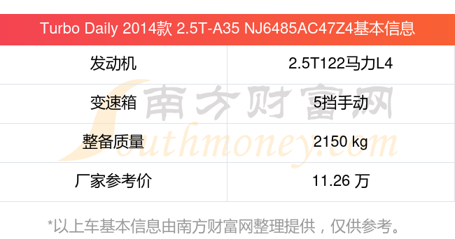 Turbo Daily 2014款 2.5T-A35 NJ6485AC47Z4動力上搭載的是一臺2.5T122馬力L4渦輪增壓發(fā)動機,匹配5擋手動擋變速箱,燃料形式為柴油,常規(guī)整備質(zhì)量2150kg,廠家參考價11.26萬元。