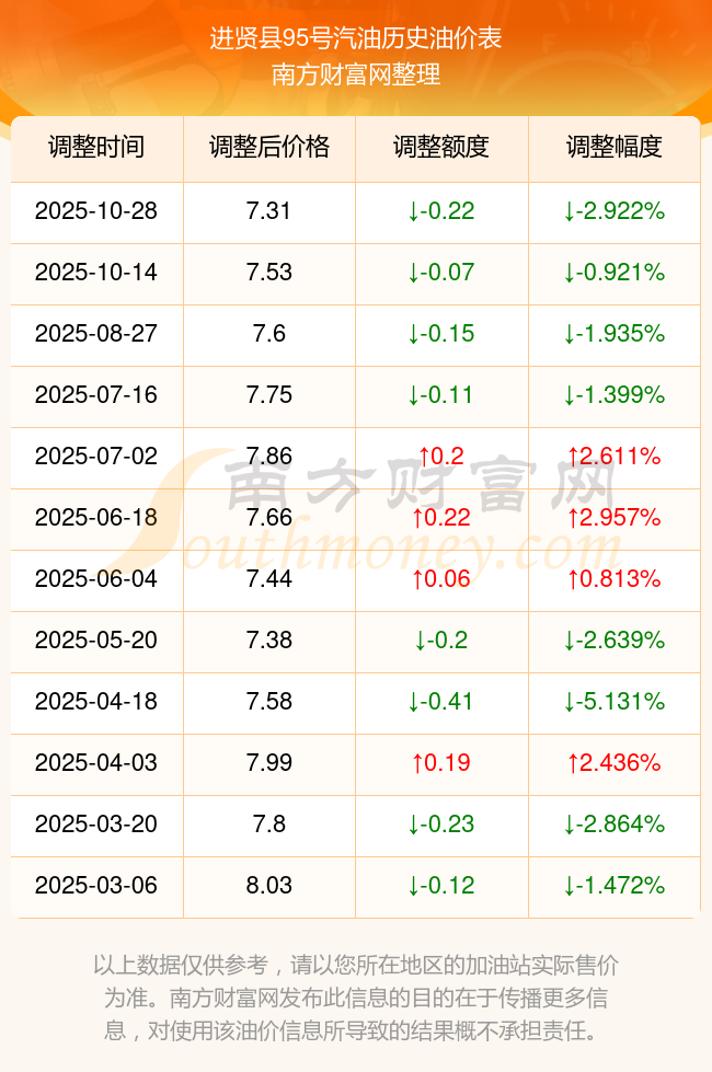 11月7日進(jìn)賢縣95號(hào)汽油歷史油價(jià)一覽表