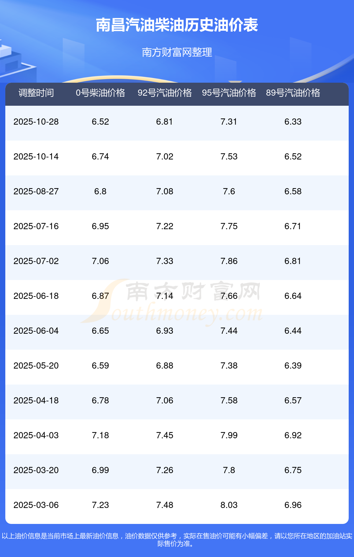 11月7日南昌汽油、柴油每升價(jià)格詳情為:92號(hào)汽油為6.81元,下調(diào)了0.21元;95號(hào)汽油為7.31元,下調(diào)了0.22元;89號(hào)汽油為6.33元,下調(diào)了0.19元;0號(hào)柴油為6.52元,下調(diào)了0.22元,本次油價(jià)調(diào)整時(shí)間為10月28日。