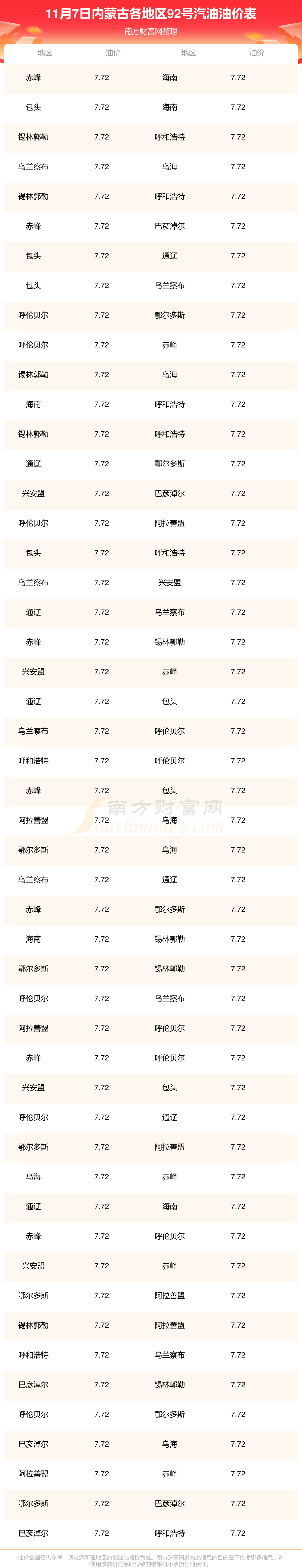 2025年11月7日內(nèi)蒙古92號汽油最新價格一覽表