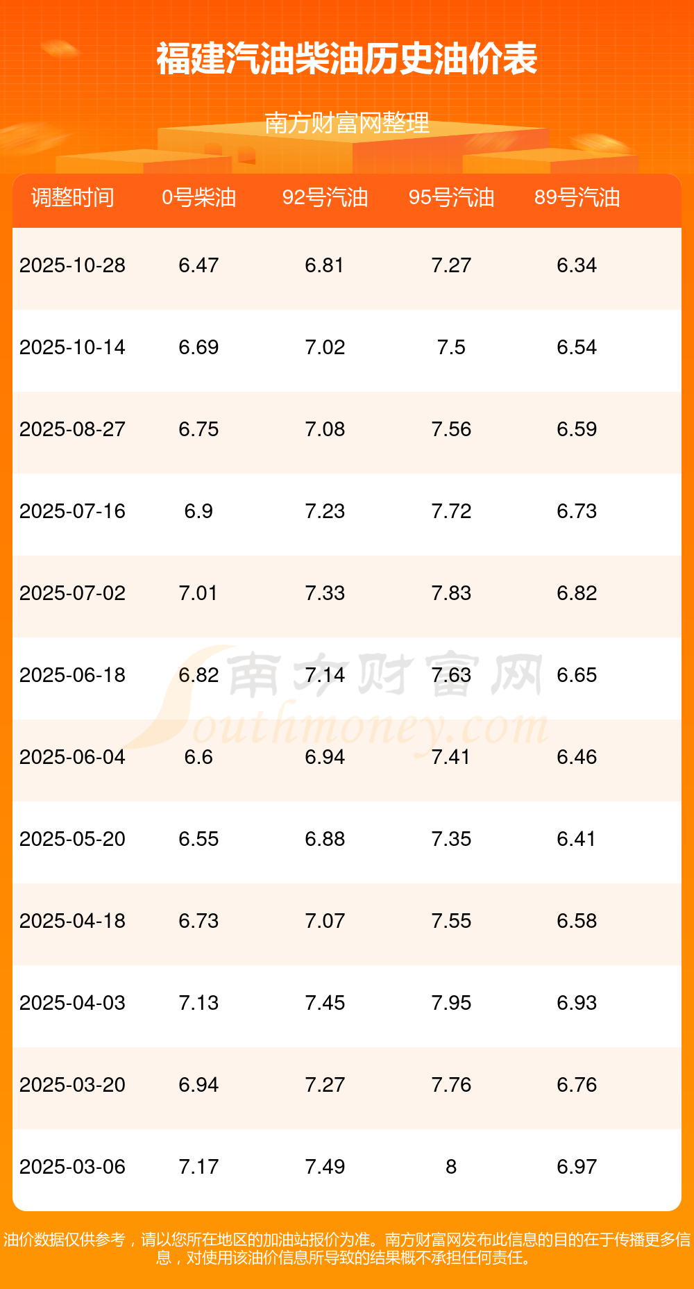 11月8日福建汽油、柴油每升的價(jià)格是多少?10月28日為本輪油價(jià)調(diào)整時(shí)間,92號(hào)汽油6.81元,下降了0.21元,下降幅達(dá)2.99%;95號(hào)汽油7.27元,下降了0.23元,下降幅達(dá)3.07%;89號(hào)汽油6.34元,下降了0.2元,下降幅達(dá)3.06%;0號(hào)柴油6.47元,下降了0.22元,下降幅達(dá)3.29%。