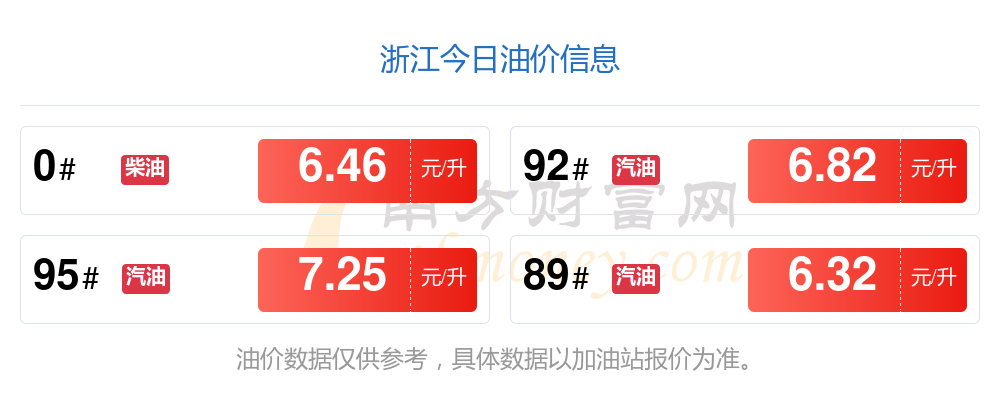 油價調(diào)整最新消息:11月8日浙江汽油、柴油每升的價格具體為:本輪油價調(diào)整時間為10月28日,92號汽油是6.82元,減了0.21元,減幅達2.99%;95號汽油是7.25元,減了0.23元,減幅達3.08%;89號汽油為6.32元,減了0.2元,減幅達3.07%;0號柴油為6.46元,減了0.22元,減幅達3.29%。下一輪油價調(diào)整時間11月10日24時。