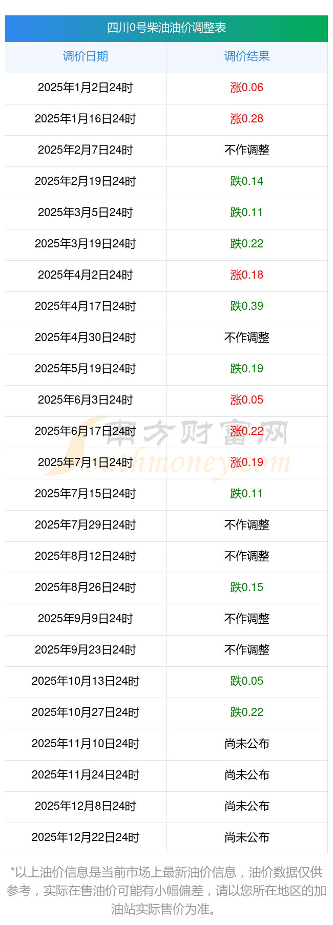 11月8日,四川0號柴油的價格是6.54元每升,本次的調(diào)整時間為10月28日,對比上次的調(diào)整下調(diào)了0.22元,下調(diào)3.254%,11月10日24時為下一輪油價調(diào)整時間,還有2.86天。