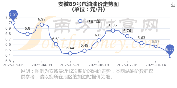 11月8日,安徽89號汽油的價格是6.37元每升,本次的調(diào)整時間為10月28日,對比上次的調(diào)整下降了0.2元,下降3.044%,11月10日24時為下一輪油價調(diào)整時間,還有2.84天。