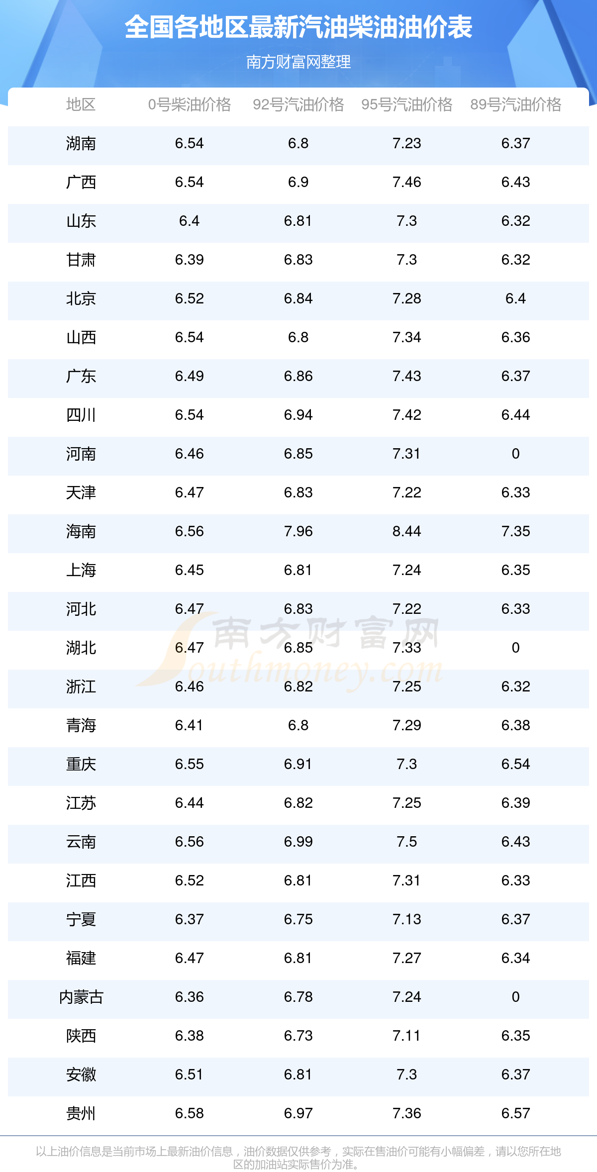 全國各地區(qū)最新油價表