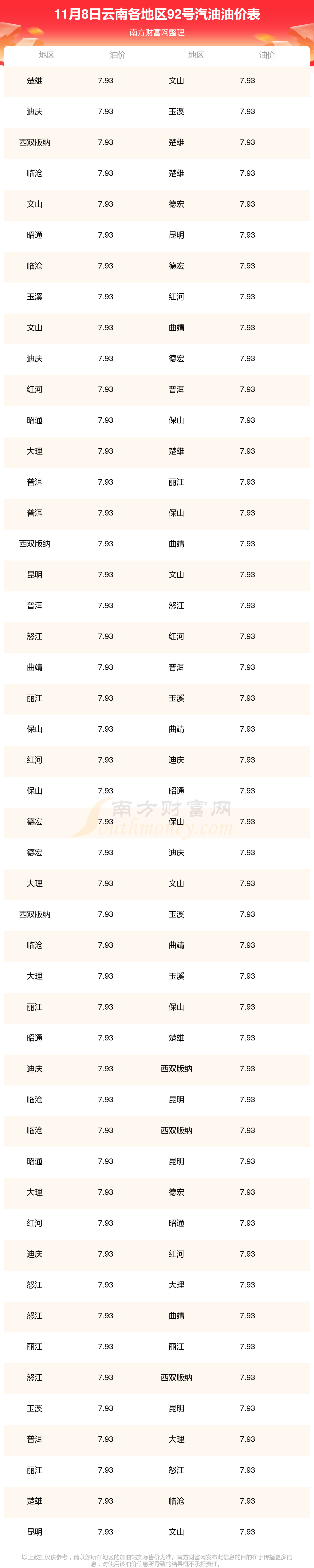 11月8日,云南92號汽油的價格是6.99元每升,本次的調(diào)整時間為10月28日,對比上次的調(diào)整跌了0.21元,跌2.917%,11月10日24時為下一輪油價調(diào)整時間,還有2.76天。