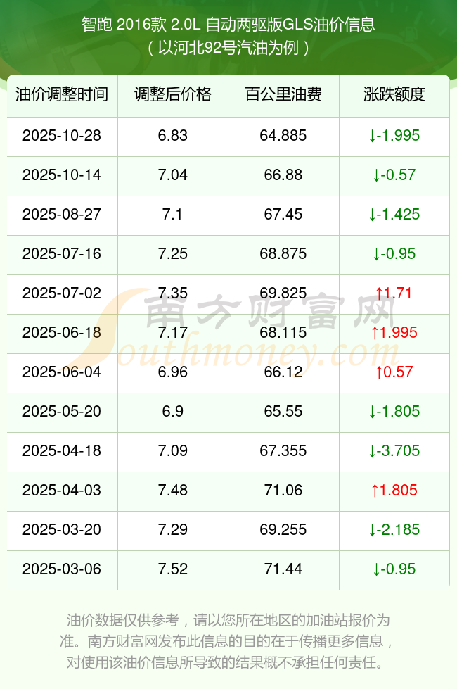 按照10月28日92號汽油最新調(diào)整價格6.83元/升來計算(以河北為例),該車型百公里平均油費為64.885元,按照上一輪10月14日調(diào)整價格7.04元/升來計算,百公里平均油費為66.88元,對比上一輪少花1.995元,下一輪油價調(diào)整時間為11月10日24時。