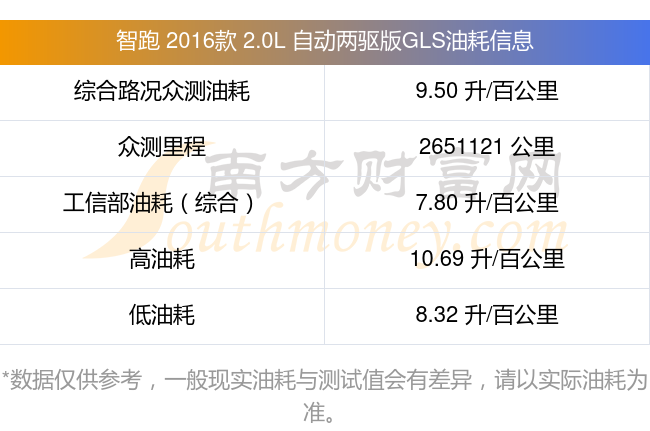 根據(jù)多位車主實測得出數(shù)據(jù),該車型低油耗為8.32升每百公里,高油耗為10.69升每百公里,綜合路況眾測油耗為9.50升每百公里,工信部綜合油耗為7.80升每百公里。