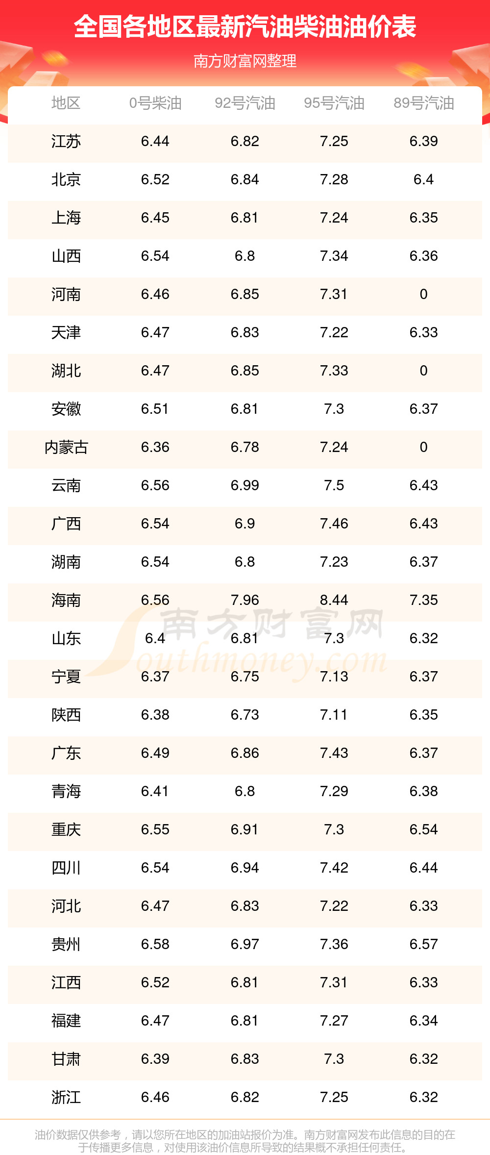 95號汽油平均價格:7元每升,其中,最高為海南,價格8.44元/升,最低為陜西,價格7.11元/升。