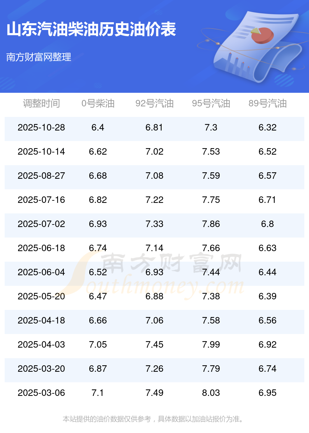 11月8日,山東0號柴油的價格是6.4元每升,本次的調(diào)整時間為10月28日,對比上次的調(diào)整下降了0.22元,下降3.323%,下次調(diào)整時間為11月10日24時,還有2.73天。