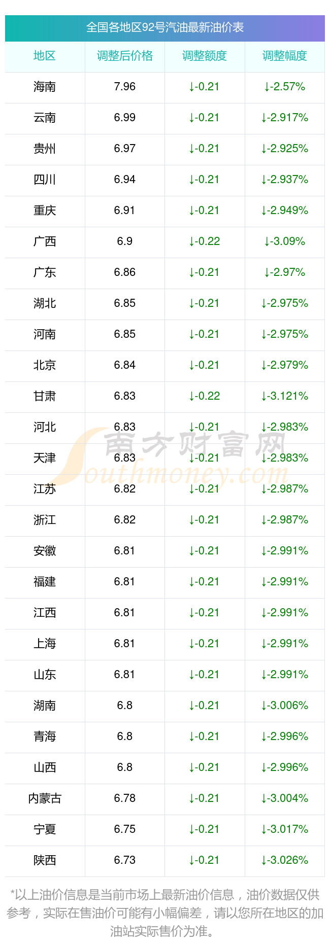 以上數(shù)據(jù)僅供參考,請(qǐng)以您所在地區(qū)的加油站實(shí)際售價(jià)為準(zhǔn)。南方財(cái)富網(wǎng)發(fā)布此信息的目的在于傳播更多信息,對(duì)使用該油價(jià)信息所導(dǎo)致的結(jié)果概不承擔(dān)責(zé)任。