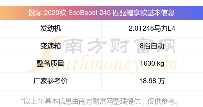 在動力方面,銳際 2020款 EcoBoost 245 四驅??享款搭載的是一臺2.0T248馬力L4渦輪增壓發(fā)動機,匹配8擋自動檔變速箱,燃料形式為汽油,常規(guī)整備質(zhì)量1630kg,廠家參考價18.98萬元。