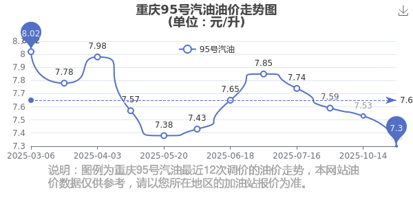重慶汽油、柴油11月8日每升最新價格:92號汽油為6.91元;95號汽油為7.3元;89號汽油為6.54元;0號柴油為6.55元,本輪油價調整時間為10月28日。下一輪油價調整時間11月10日24時,距離現(xiàn)在還有2.71天。