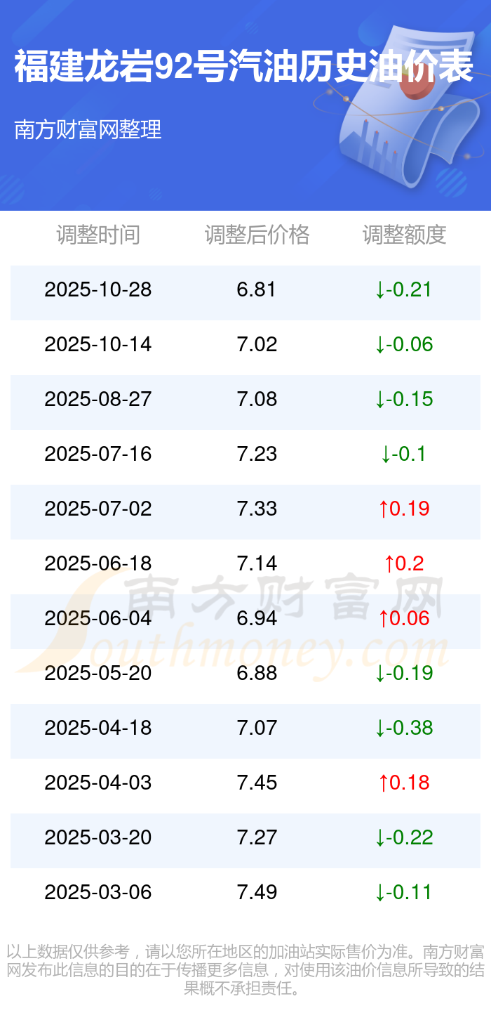 11月8日福建龍巖92號汽油價格查詢:每升6.81元(10月28日油價調(diào)整后的價格),相對上次調(diào)整時間10月14日的油價7.02元每升,下跌了0.21元,下跌2.991%。下一輪油價調(diào)整時間11月10日24時,距離現(xiàn)在還有2.7天。