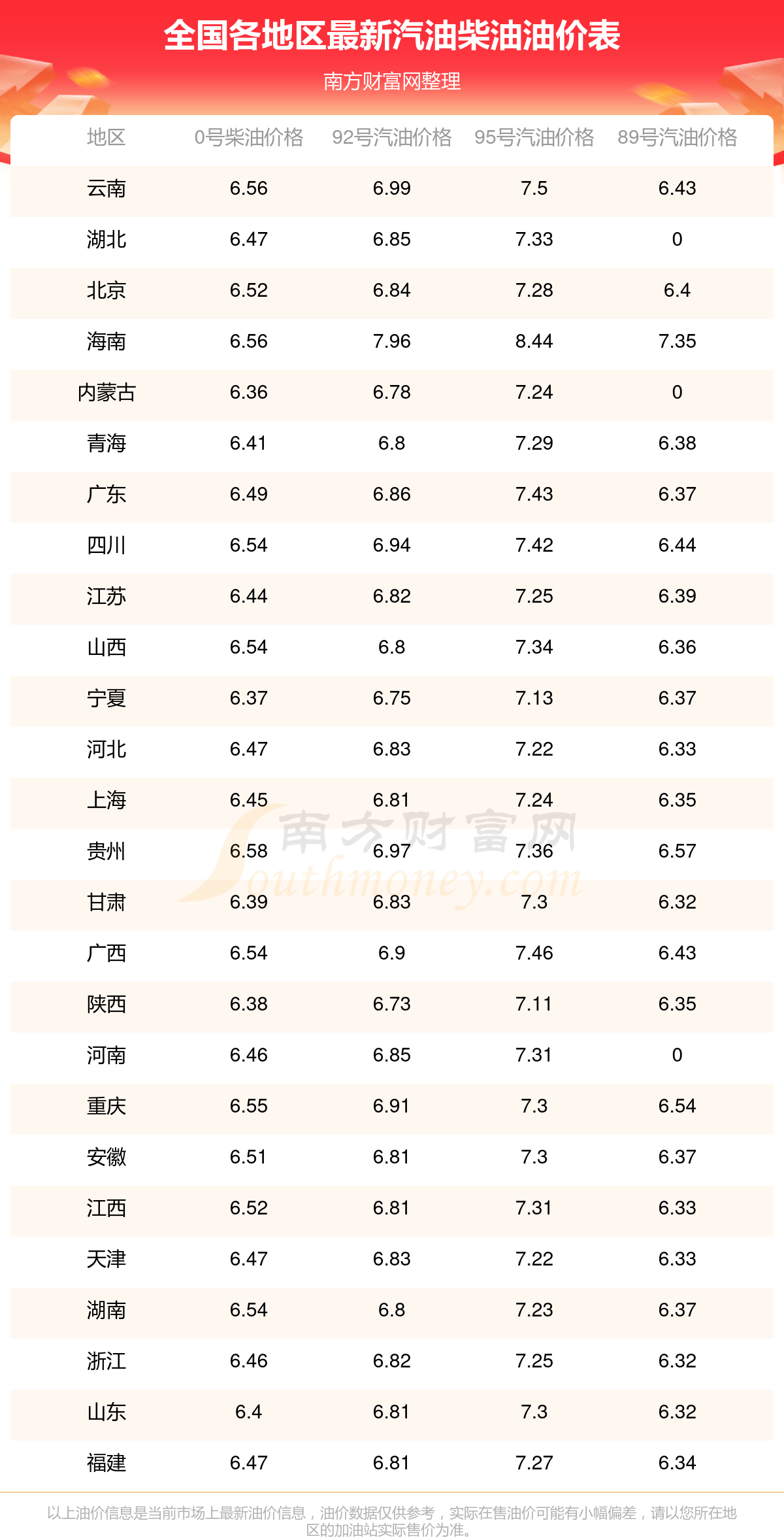 全國89號汽油最新平均價格為:6元每升,其中,最高為海南,價格為7.35元/升,最低為浙江,價格為6.32元/升。