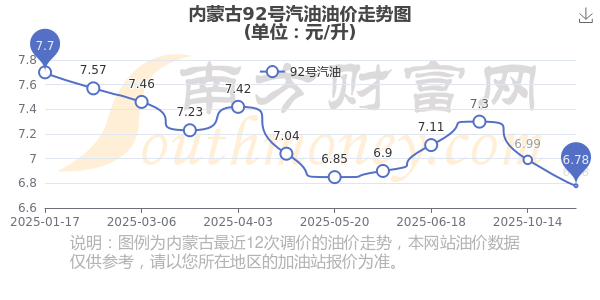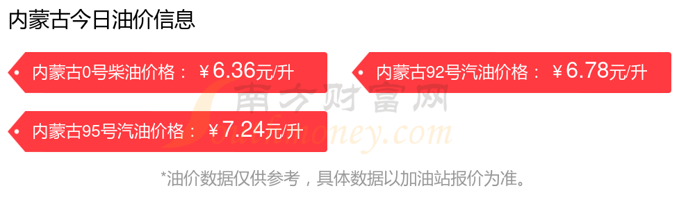 11月8日,內(nèi)蒙古汽油、柴油每升的價格為:92號汽油6.78元,下跌了0.21元;95號汽油7.24元,下跌了0.22元;0號柴油為6.36元,下跌了0.22元,本輪調(diào)整時間是10月28日。