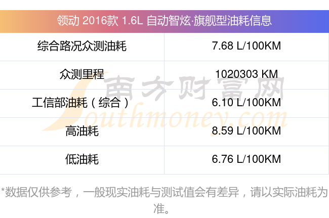 根據(jù)多位車主實(shí)測(cè)得出數(shù)據(jù),該車型低油耗為6.76升/百公里,高油耗為8.59升/百公里,綜合路況眾測(cè)油耗為7.68升/百公里,工信部綜合油耗為6.10升/百公里。