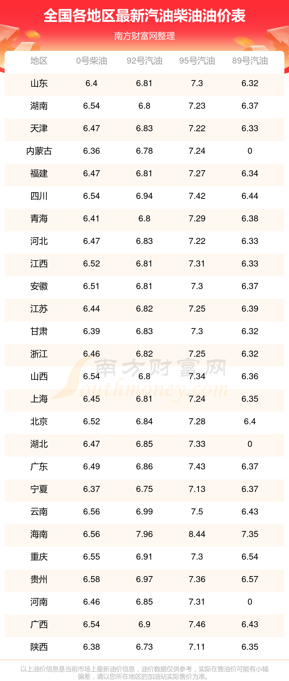 本次油價(jià)的調(diào)整時(shí)間為10月28日,調(diào)整后全國(guó)92號(hào)汽油平均價(jià)格為7元每升,其中,最低的是陜西,6.73元每升,最高的是海南,7.96元每升。全國(guó)95號(hào)汽油平均價(jià)格為7元每升,其中,最低的是陜西,7.11元每升,最高的是海南,8.44元每升。全國(guó)0號(hào)柴油平均價(jià)格為:6元每升,其中,最低的是內(nèi)蒙古,6.36元每升,最高的是貴州,6.58元每升。全國(guó)89號(hào)汽油平均價(jià)格為6元每升,其中,最低的是浙江,6.32元每升,最高的是海南,7.35元每升。,下一輪油價(jià)調(diào)整時(shí)間11月10日24時(shí),距離現(xiàn)在還有2.67天。