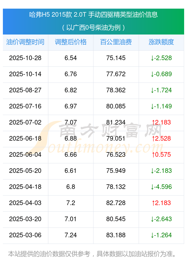 根據10月28日0號柴油最新調整價格6.54元/升來計算(以廣西為例),該車型每百公里的平均油費是75.145元,上一輪10月14日調整價格6.76元每升來計算,每百公里的平均油費是77.672元,對比上一輪少花2.528元,下一輪的油價調整時間是11月10日24時。